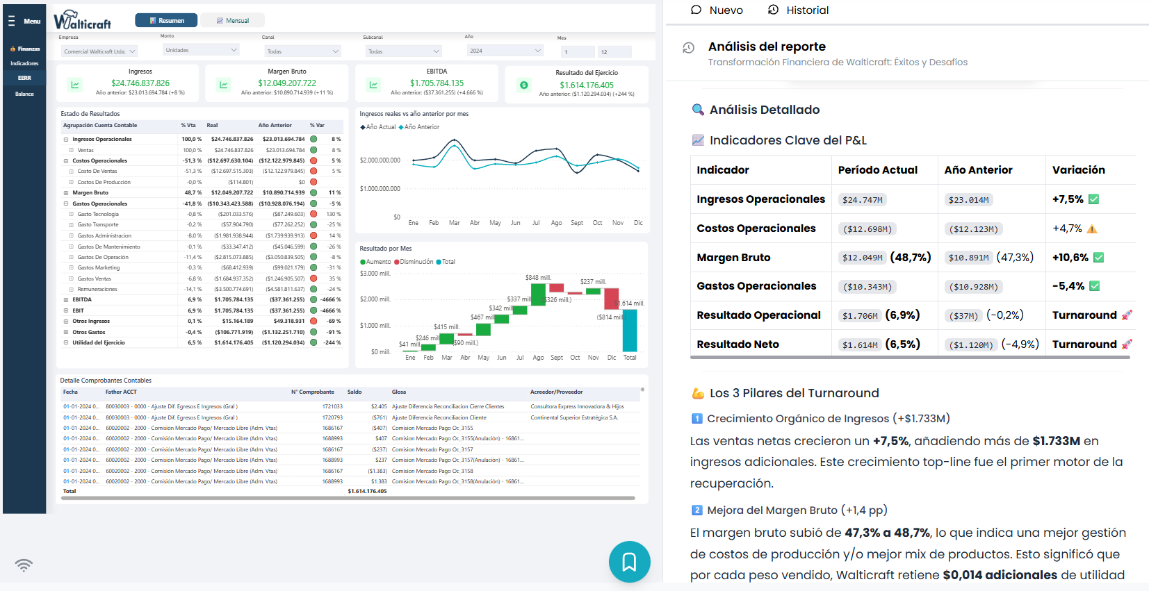 Conecta tus bases de datos y pregunta lo que necesites en lenguaje natural. El agente analiza tablas, cruza información de múltiples fuentes y genera gráficos listos para presentar. Sin escribir una sola fórmula ni depender de un analista.